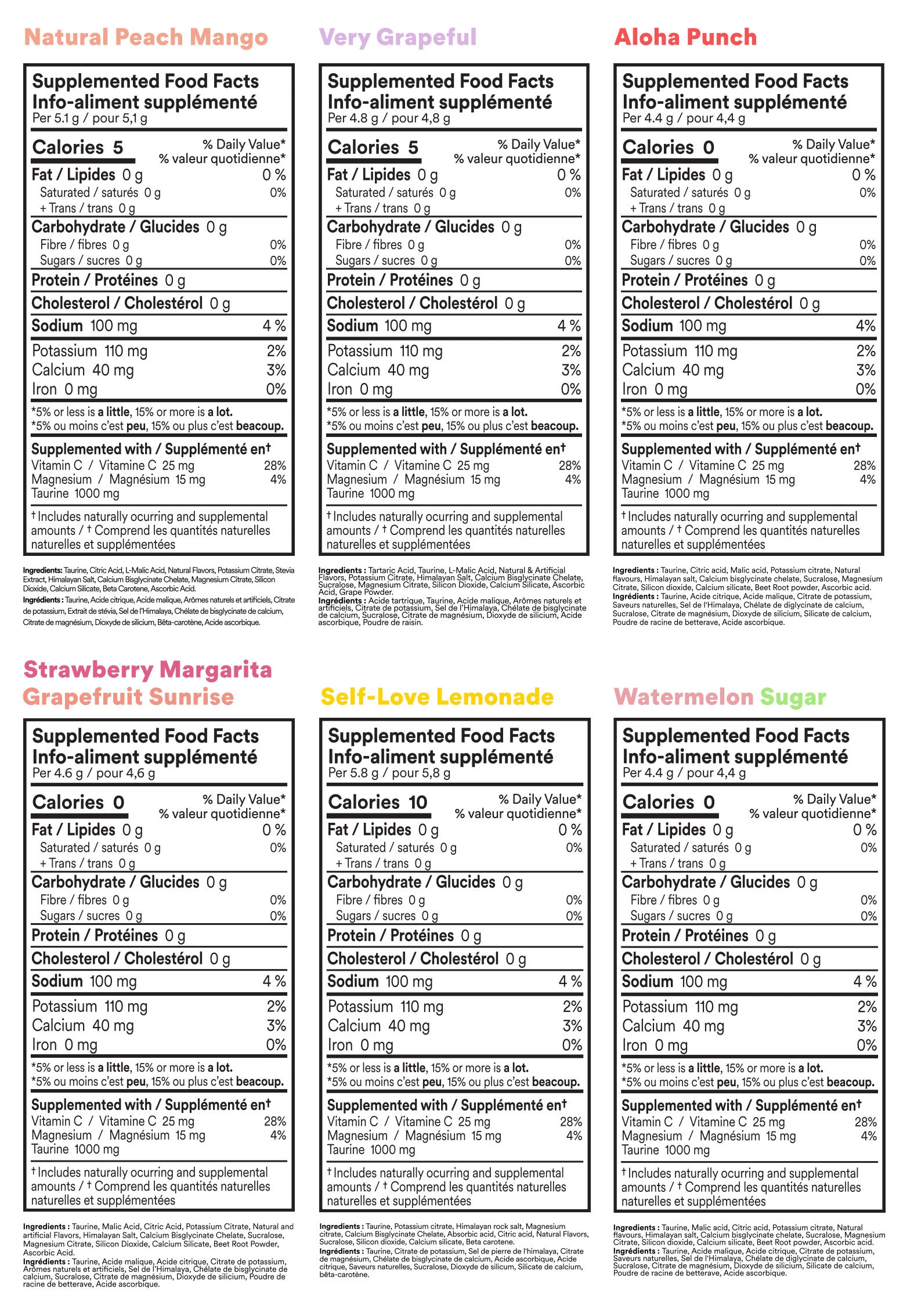 Powdered Drink Mix in Seven Refreshing Flavors: Choose from all the flavours! Very Grapeful, Aloha Punch, Self-Love Lemonade, the list goes on! Also, Peach Mango flavour is now available, made with all-natural ingredients and sweetened with stevia.