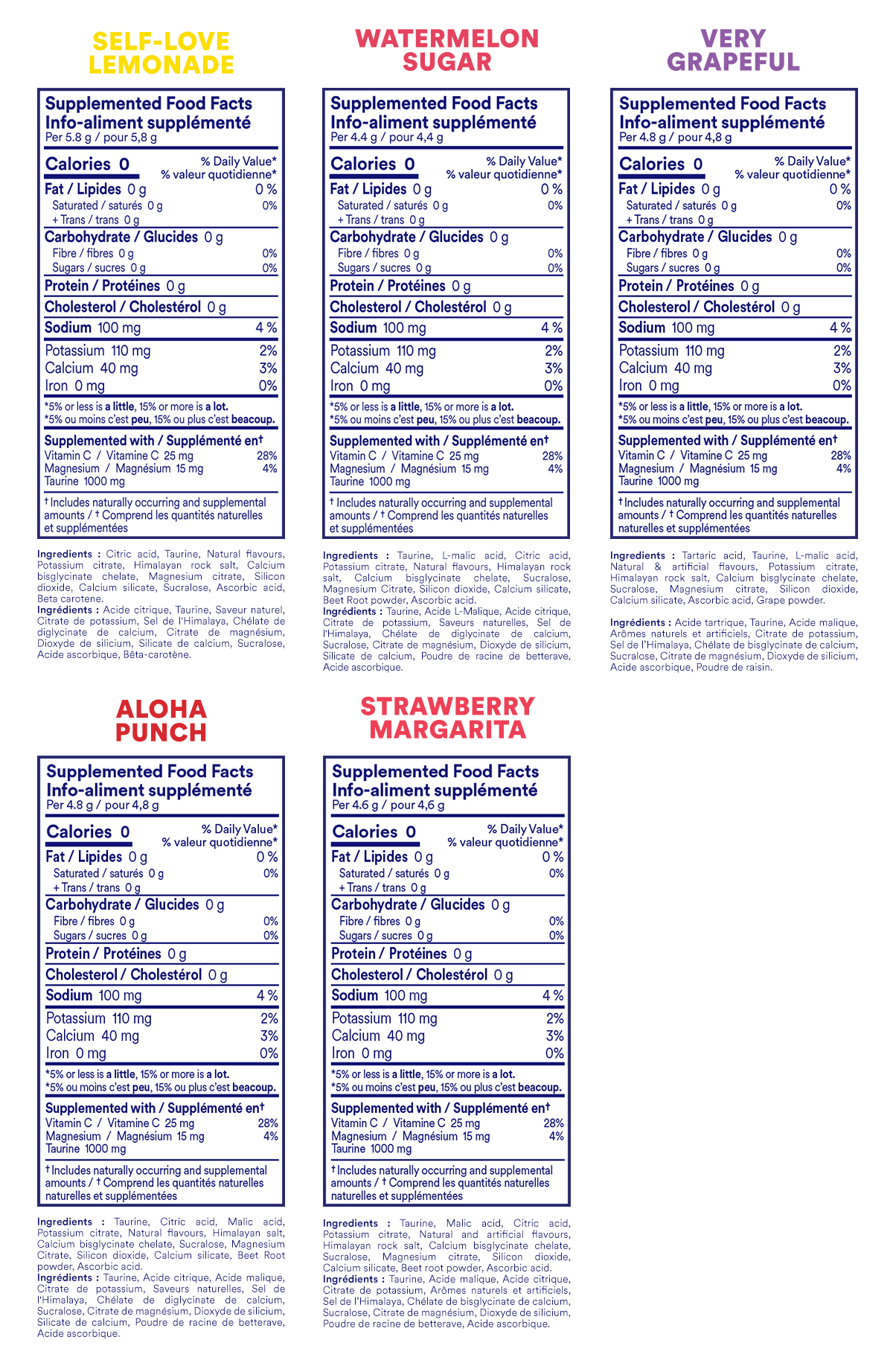 Powdered Drink Mix in Seven Refreshing Flavors: Choose from all the flavours! Very Grapeful, Aloha Punch, Self-Love Lemonade, the list goes on! Also, Peach Mango flavour is now available, made with all-natural ingredients and sweetened with stevia.
